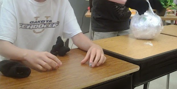 Student one gets to keep any candy they can retrieve during their turn. Student two is trying to roll doubles on the dice. Student three (and probably everyone else in the room) is cheering to hurry! As soon as student two rolls doubles, they get the ball. Student one then gives the gloves to the next person. It keeps going around the circle as long as their still candy left in the ball – which should be until the very end if you made it right. ๐