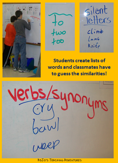 After students wrote down their 2-5 words (such as the to, too, two above), their classmates had a chance at guessing what the similarity was. Our first some were wayyyyy too easy and we guessed them right away! So I challenged the students to come up with lists that had more than one rule. The top picture below did just that! I love challenging students and watching them step up and exceed my expectations! 🙂